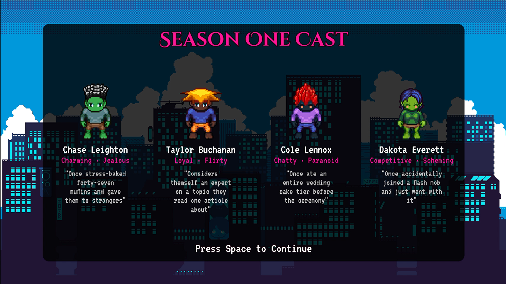 In this game you get a cast of four procedurally generated characters. Each one has two attributes. These can include things like "flirty" or "paranoid".